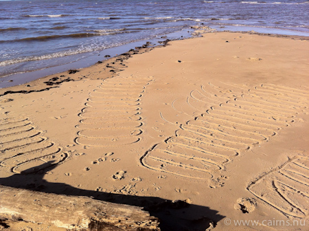 落書きおじいちゃん 太田 祐 14年前 半月ほど前の大荒れの何日かの影響でビーチには以前として大量の漂着物が溢れている。ここは時々野鳥を観察したり散歩に来る浜辺で自分以外に誰か一人でもいると込んでいると感じる。遠くの方に年配の男性が座っているのが見えるだろうか?む、先行者。同じように独りの時間を楽しみたいのだろう。20分ほど待って彼が去ってから向こうへ歩いて行ってみると… おじいさんが座っていた辺り一面に幾何学模様が! …これは一体…。