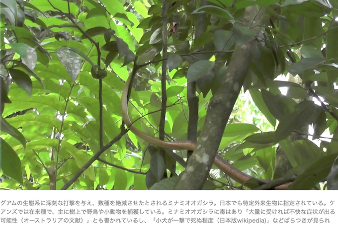 グアムの生態系に深刻な打撃を与え、数種を絶滅させたとされるミナミオオガシラ。日本でも特定外来生物に指定されている。ケアンズでは在来種で、主に樹上で野鳥や小動物を捕獲している。ミナミオオガシラに毒はあり「大量に受ければ不快な症状が出る可能性(オーストラリアの文献)」とも書かれているし、「小犬が一撃で死ぬ程度(日本版wikipedia)」などばらつきが見られる。なおオーストラリア人には生物毒が効かない傾向にありその点も考慮しなければいけない。