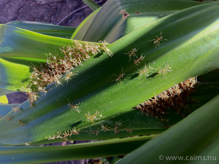 ツムギアリが紡いでいる現場 太田 祐 14年前 ツムギアリについては随分昔にマクロ写真で一度紹介して、割合アクセスの多いページになっているけどツムギアリが紡いで巣を作っている最終に出くわしたので写真と動画で撮ってみた(携帯だけど) ツムギアリがツムギアリを掴んでまたツムギアリがそれを掴んで、という鎖状になって葉を引っ張って保持しているのが分かる。 学名 Oecophylla smaragdina 英名 Green Ant 単に日本語でグリーンアントと呼ばれる事も多い。 二日後に見たら完成していた。