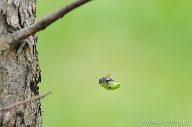 ハキリバチ 太田 祐 14年前 かじりとった葉を抱えて運んでいくハキリバチ。 葉は巣材になる。数メートル先の茂みに着陸して見失ったのでそのあたりで営巣しているのだろう。 こういうのが撮れた日は足取りも軽い!