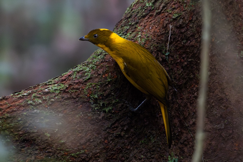 オウゴンニワシドリは数年前、各ガイドが知っていた数羽の成鳥オスが一斉に姿を消すという不審な事変があり長期間の内定期間を費やした組織的密猟と見られている。それ以降茶色い若雄ならパラパラいるもののこうした黄金色の成鳥は大変貴重。しかも踊り場に張り付いている春以外の時期となると、オウゴンニワシドリオスは無限のジャングルに薄く散っているだけとなりさらに困難になる。