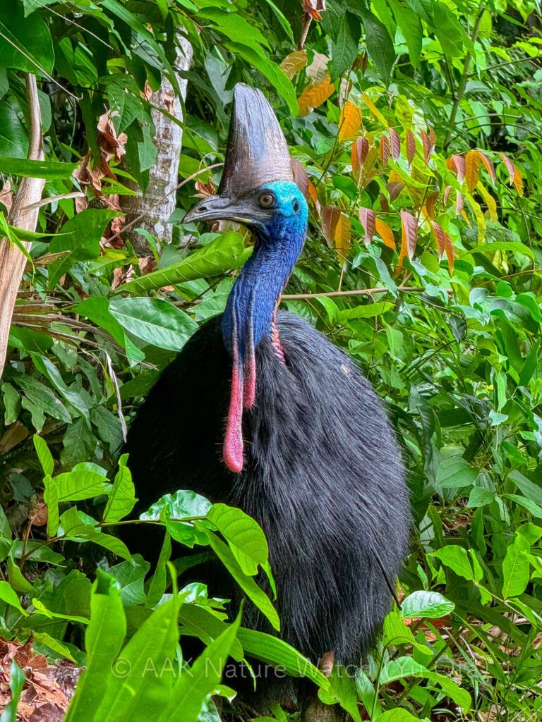 なんだか騒がしいぞ、と覗いてみると若いオスのコウロコフウチョウが求愛の練習中。成長オスの黒い姿になるには数年を要するのだ。