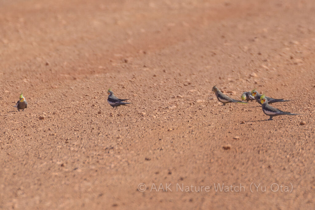 写真は未舗装道路に降りて餌を探す野生のオカメインコ。カーペンタリア湾付近。