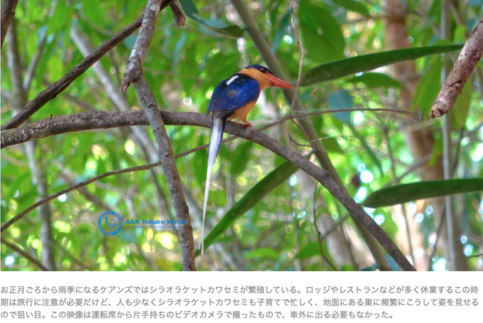 雨季にシラオラケットカワセミの繁殖を狙う 太田 祐 6年前 お正月ごろから雨季になるケアンズではシラオラケットカワセミが繁殖している。ロッジやレストランなどが多く休業するこの時期は旅行に注意が必要だけど、人も少なくシラオラケットカワセミも子育てで忙しく、地面にある巣に頻繁にこうして姿を見せるので狙い目。この映像は運転席から片手持ちのビデオカメラで撮ったもので、車外に出る必要もなかった。