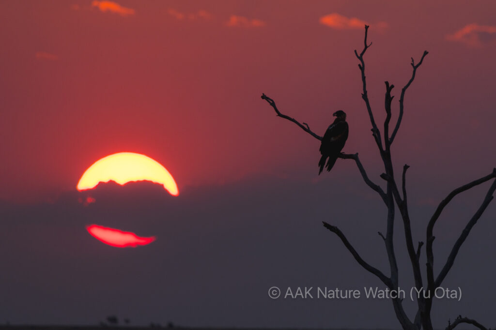 日没が近づく中、オナガイヌワシが枯れ木に止まってそれを眺めていた。