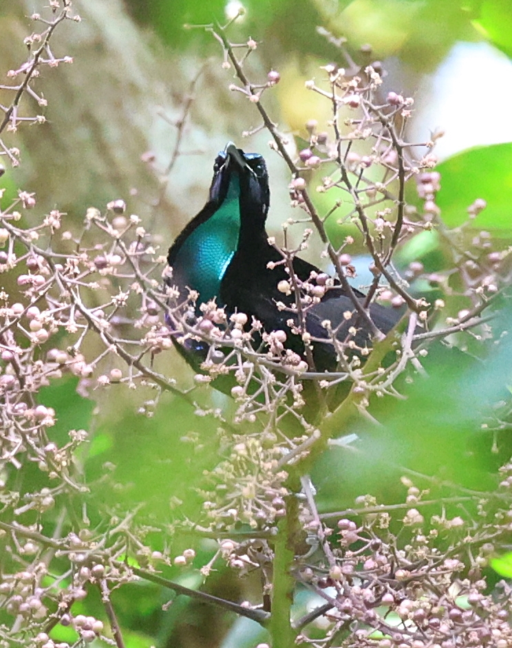 確かに強い雨ではないもののやまない小雨、泥だらけになった未舗装道路と静かな森。アイアンレンジ二日目の朝も厳しいスタートだったが、このメスのヤシオウムの飛来は大いに助かった。写真だと逆光でこんなのだけど、何しろ10分近くいてくれたので強力な望遠鏡で全員が繰り返し観察できた。