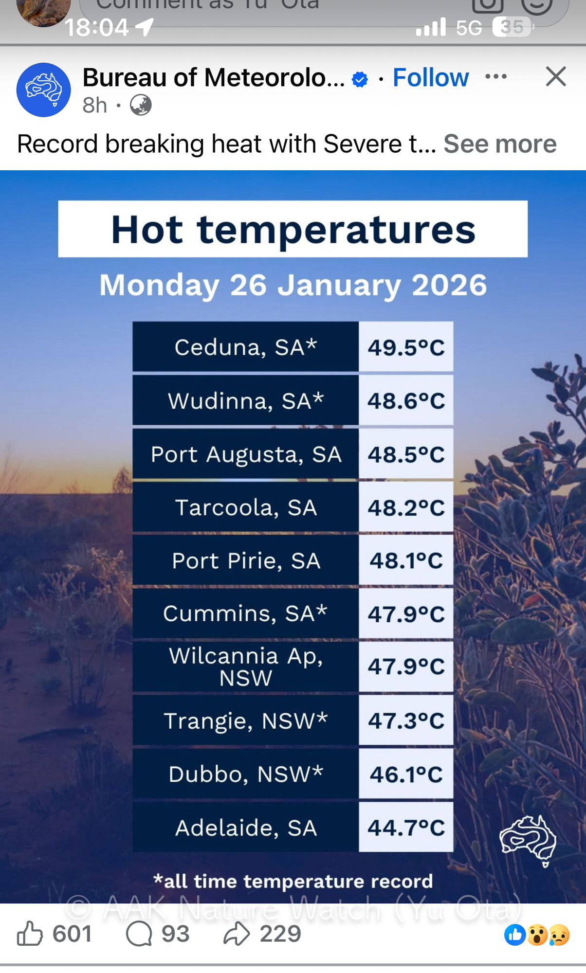 近年の日本の暑さは狂っている、とよく聞くけどオーストラリア各地の夏の最高気温はこうして50度に迫り(いや時々超えていたが)、街中の電光掲示板が気温56度を指している写真が拡散されていた。日本の夏はそれよりは20度低いじゃないか。