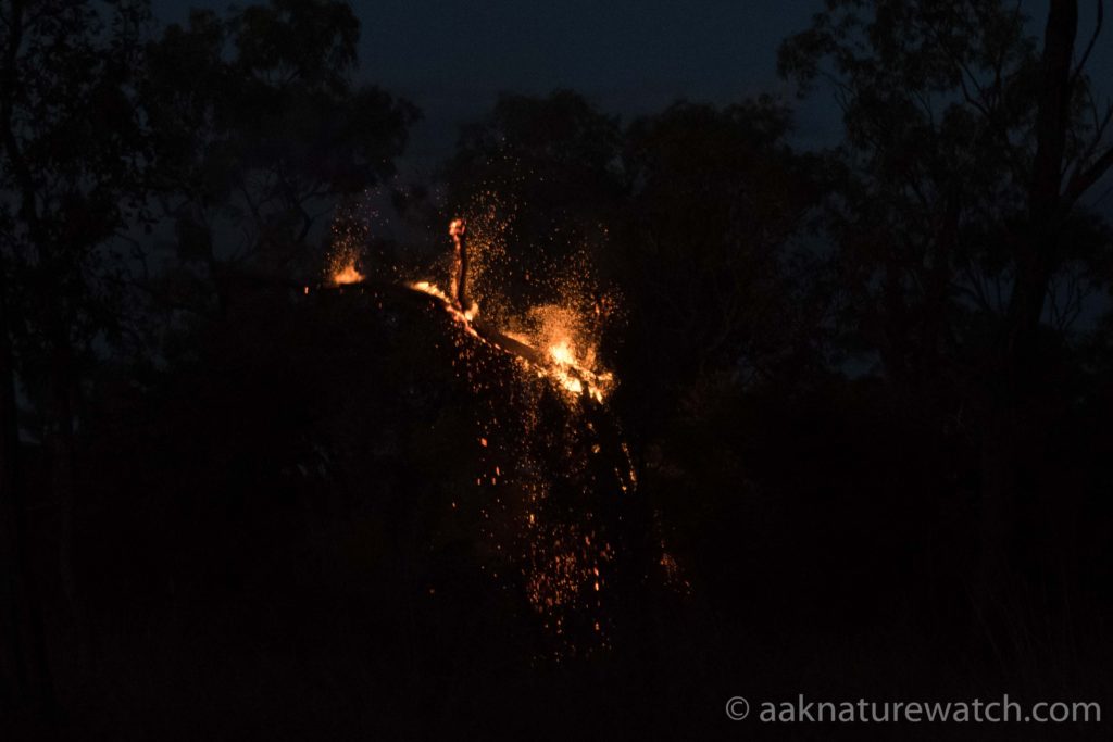 日没直後。調査地点の山奥から野営地へ向かっていると、一本の木が、この一本の木だけが炎上しているという不思議な光景に出会う。なんでこうなった?