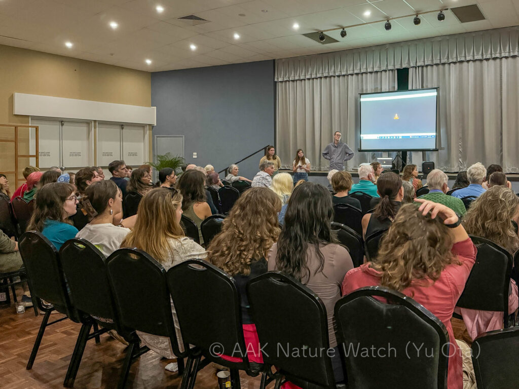 マランダにはアメリカの某大学生団体の野外学習センターが古くからあり、フィールド調査、動物調査に関心がある学生がほぼ常時何十人も滞在しながらさまざまな調査活動や研修を行なっている。このアメリカの某大学生団体の拠点はコスタリカやカンボジア、ケニア(奇しくもいずれも私が添乗員として野鳥ツアーで出かけた国)など世界の生態系ホットスポットにあるけど、オーストラリアはマランダにある。マランダとはやはりそういう別格の土地なんだよ。この学生達は私がボランティアをしている植林団体にも姿を見せるのでよく知っているけど、週末に研究発表会をアサートンのホールでするというので出かけてきた。