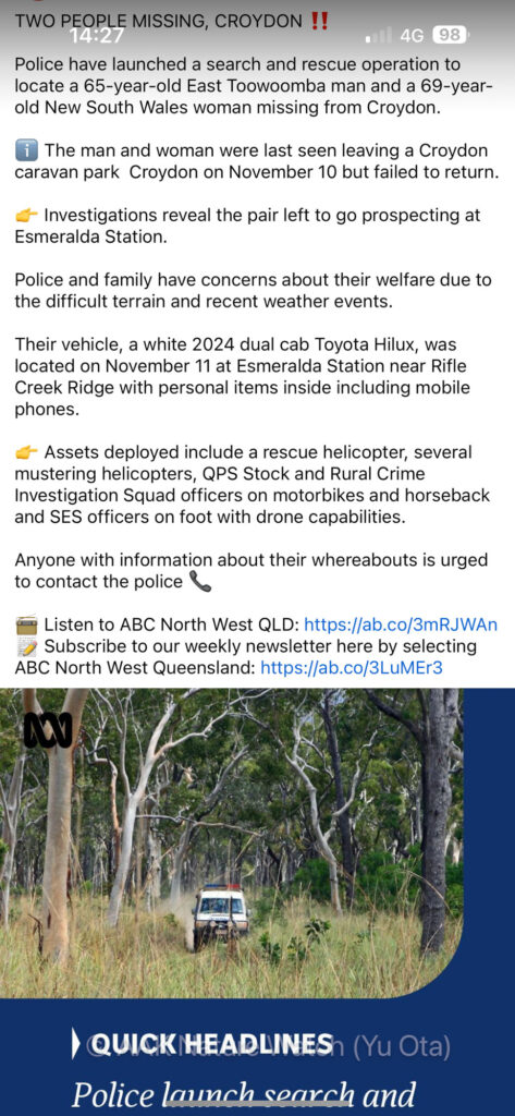 私が興味を持ったのはニュースの最後の方だ。こんな僻地で行方不明者が出た途端に、周辺の大牧場が所有するヘリコプター数機が有志で捜索を開始、警察の辺境特別班によるオフロードバイク隊と騎馬隊が出動、消防団は徒歩とドローンにより捜索をしているという。写真はランドクルーザーパトカーがとんでもない道を、というか道でさえない林を踏み潰しながら探している。
