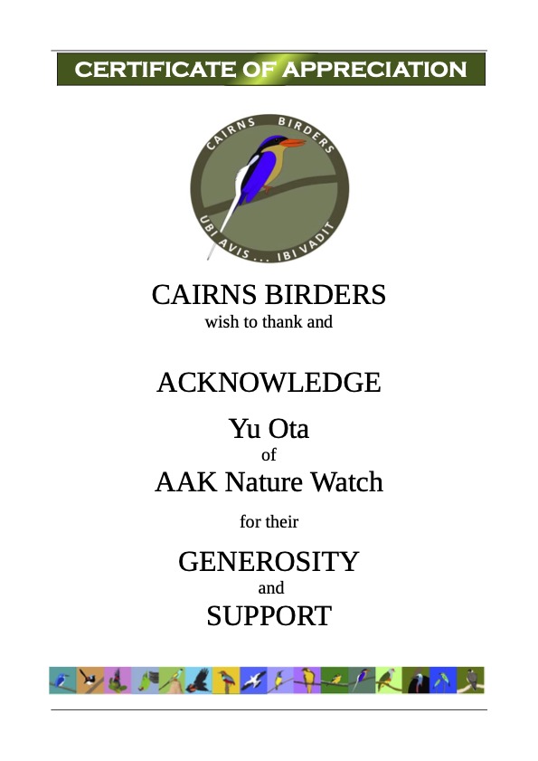 この罪悪感を埋めるため簡単なアクションを始めることにした – 資金提供です。手始めにケアンズの観察会に何百ドルかの寄付をした。若干違和感もあるけど、それでもボランティアも寄付もどちらもしない人よりはいいでしょう。なぜ彼らか?と言えば近年バードウォッチングの啓蒙活動で素晴らしい功績を残していると判断したから。野鳥の会に任せることなく自分の判断で最適な寄付先を考え、今後も積極的に寄付を続けていくつもりです。(←画像は団体からの感謝状)