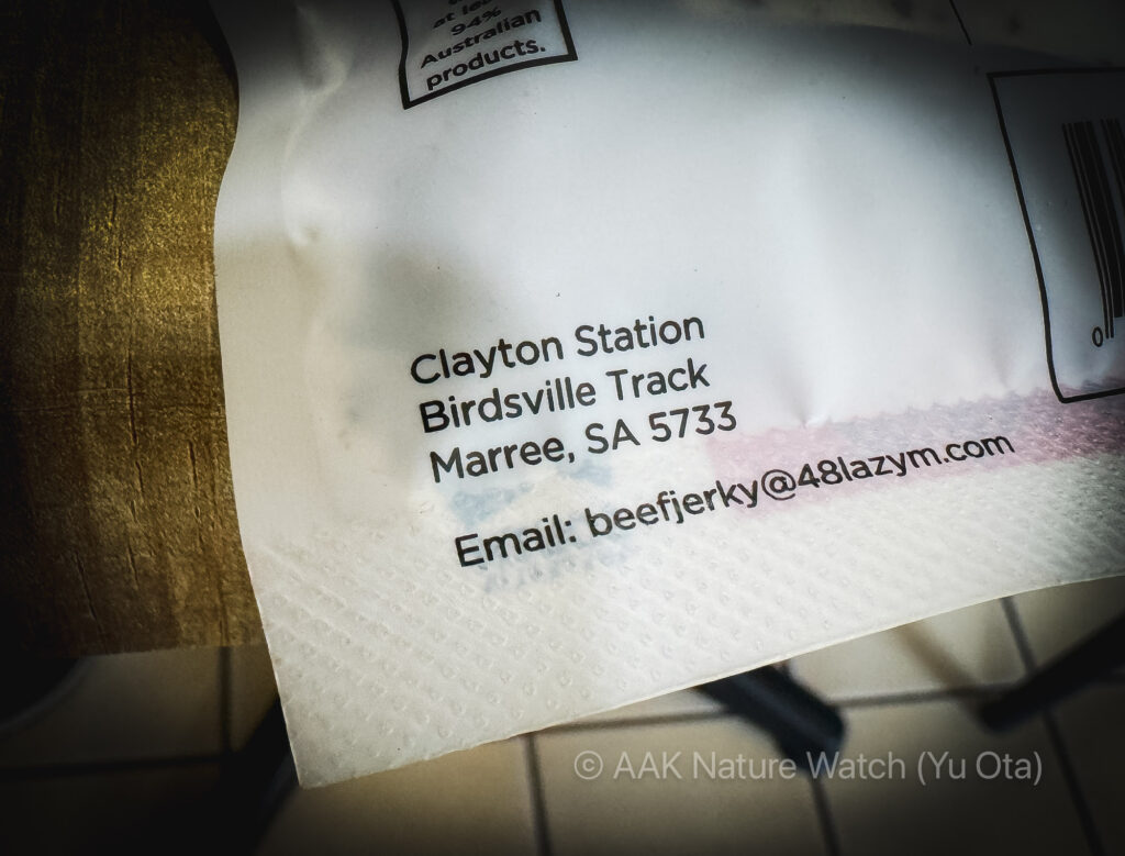 バーズビル街道を本拠地にする野鳥ガイドに「おい、バーズビル街道で作られたビーフジャーキーが遥々QLD州のレイベンスホーのガソリンスタンドで売っているぞ」とメールしたら「なんでそんなところまで辿り着いたのか全然わからん」と笑っていた。この牧場のあたりはクイナなどを探すために時々停車するところだ、とも。