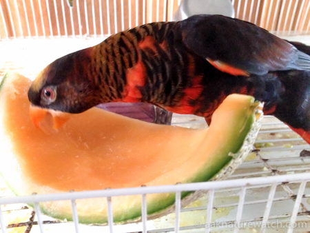 ロリキートは陽気な性格なうえ、同サイズの生き物の中ではかなり瞳が大きいので感情が分かり易い。メロンをもらって超嬉しい!の図。