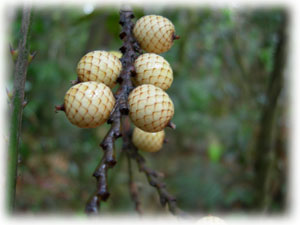 頑丈で、家具にも使用される一方、かぎ爪のようなツタを持ち、他の植物に絡まって熱帯雨林の樹冠をめざすWaite a Whle(直訳 ちょっと待っての木)。なぜならとっても衣服にひっかっかりやすく、外そうとしているうちに別のが足に引っかかり、格闘しているうちに肩にも引っかかり、という厄介極まりない植物。写真はそんな植物の実でこの植物がこんな実をつける事は意外とあまり知られていない。