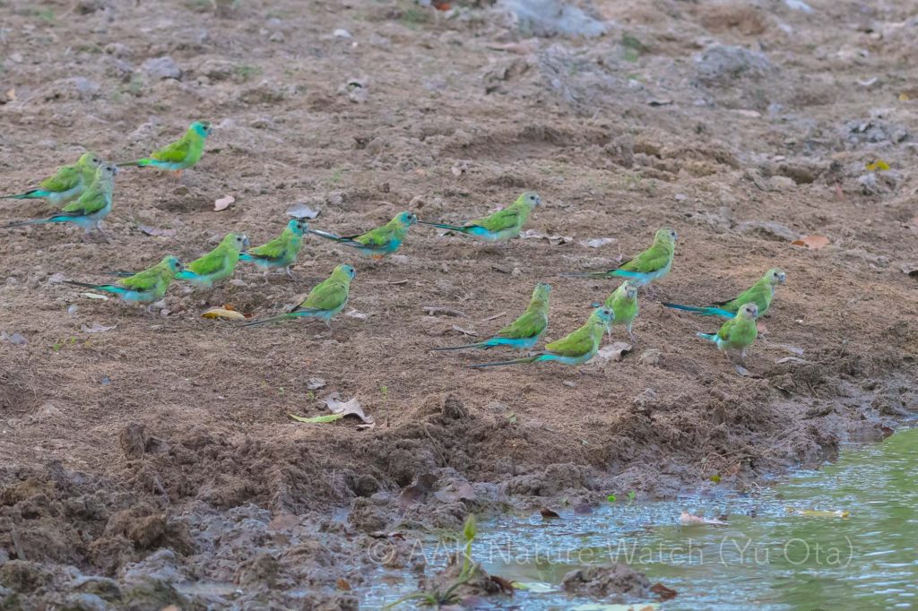 キビタイヒスイインコは近年あまり見つけがいのない状況が続いていたけど、ため池に集まるこの日の姿はとても自然で良かった。毎回こうして見られるといいのに。