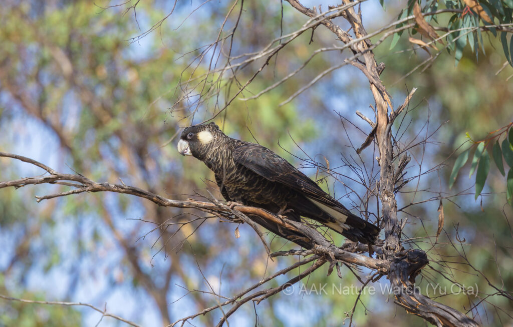 パース周辺に3種類いるクロオウムのうち、オジロクロオウムは先日一羽が木のてっぺんで止まって長時間鳴いていたので全員がしっかり見ることができた。普段はもうちょっといるけど1870年の観測開始以来最悪の日照りに襲われているためか、オジロクロオウムはそれっきり。こちらは良く似ているけどニシオジロクロオウムの方。元々一種類だと思われていたオジロクロオウムはカーナビーさんが嘴の形状が異なる群れがいることに気がついて2種類に分裂。実際この2種類が混じり合っていることは普通なく、別々の場所で過ごしている。鳴き声もわずかに異なる。