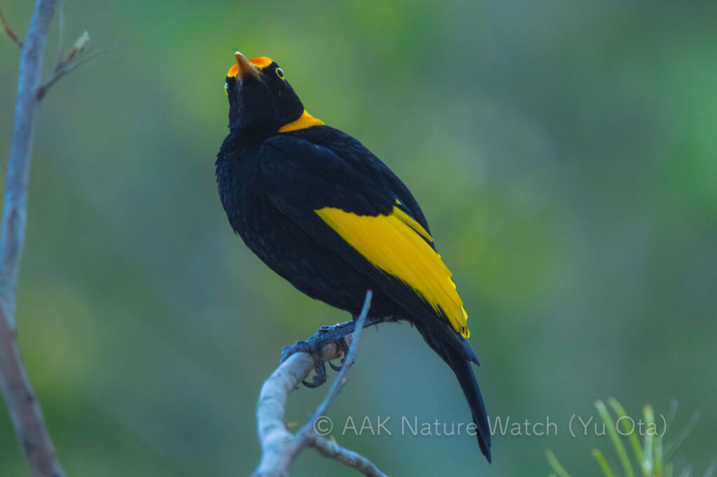 キミミミツスイも早朝バードウェーブに参加。人馴れしやすい野鳥である彼らは、カフェなどに侵入して食べ残しのジャムやクリームを餌にしていたりする。